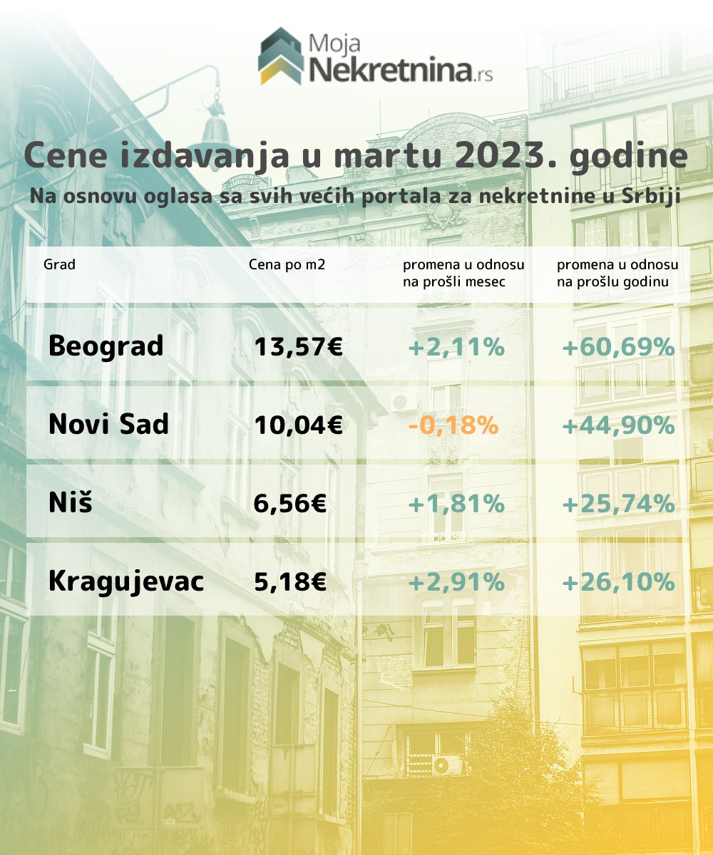 Kada su cene izdavanja u pitanju, došlo je do povećanja cena od +1.53% u odnosu na prethodni mesec. Najveći skok je zabeležen u Kragujevcu (+2,91%) gde stanarina za prosečan dvosoban stan iznosi 265€, Beogradu (+2,11%) 700€, Nišu (+1,81%) 337€, dok je cena stanarina u Novom Sadu opala u odnosu na prethodni mesec (-0,18%) gde je cena izdavanja prosečnog dvosobnog stana 516€.