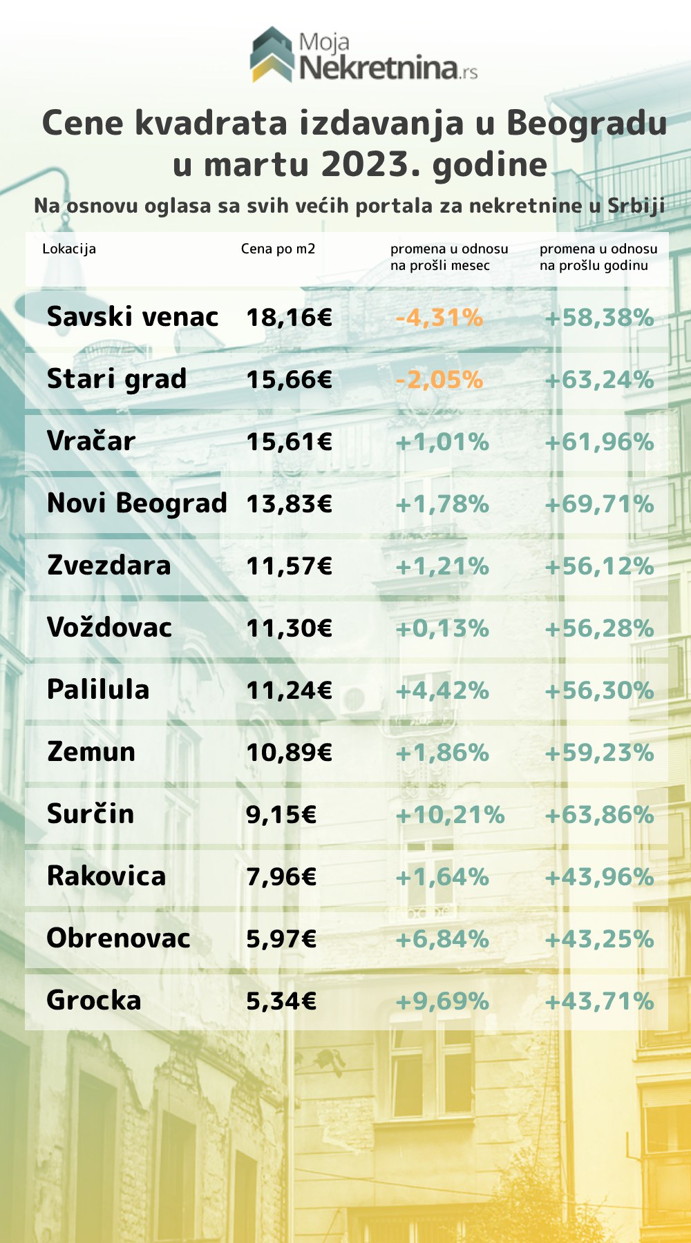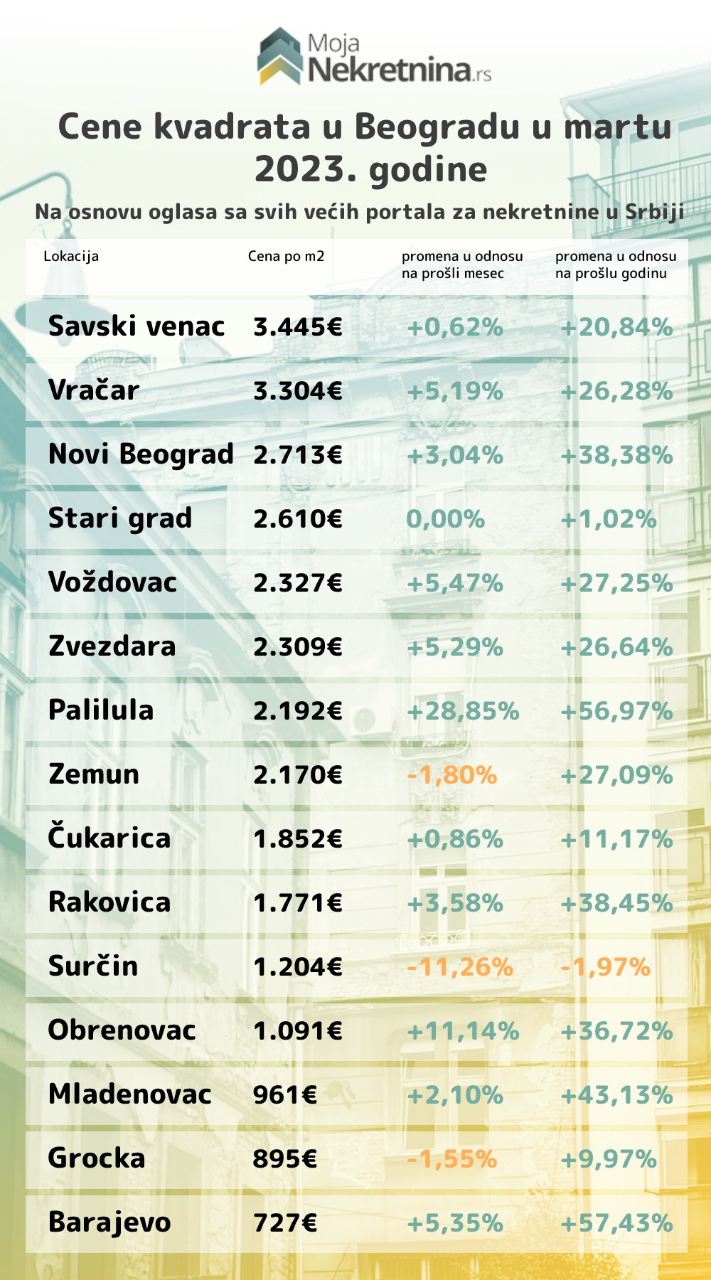 U martu 2023. godine, cene kvadrata su porasle u proseku za 2.25% u odnosu na prošli mesec. Cena je najviše skočila u Beogradu (+3,30%) gde prosečna cena kvadrata iznosi 2.409 €, zatim u Novom Sadu (+1,98%) 2.340 €, Kragujevcu (+1,97%) 1.126 €. Od većih gradova u Nišu je došlo do blagog pada (-0,02%) gde je prosečna cena kvadrata iznosila 1.441 €.